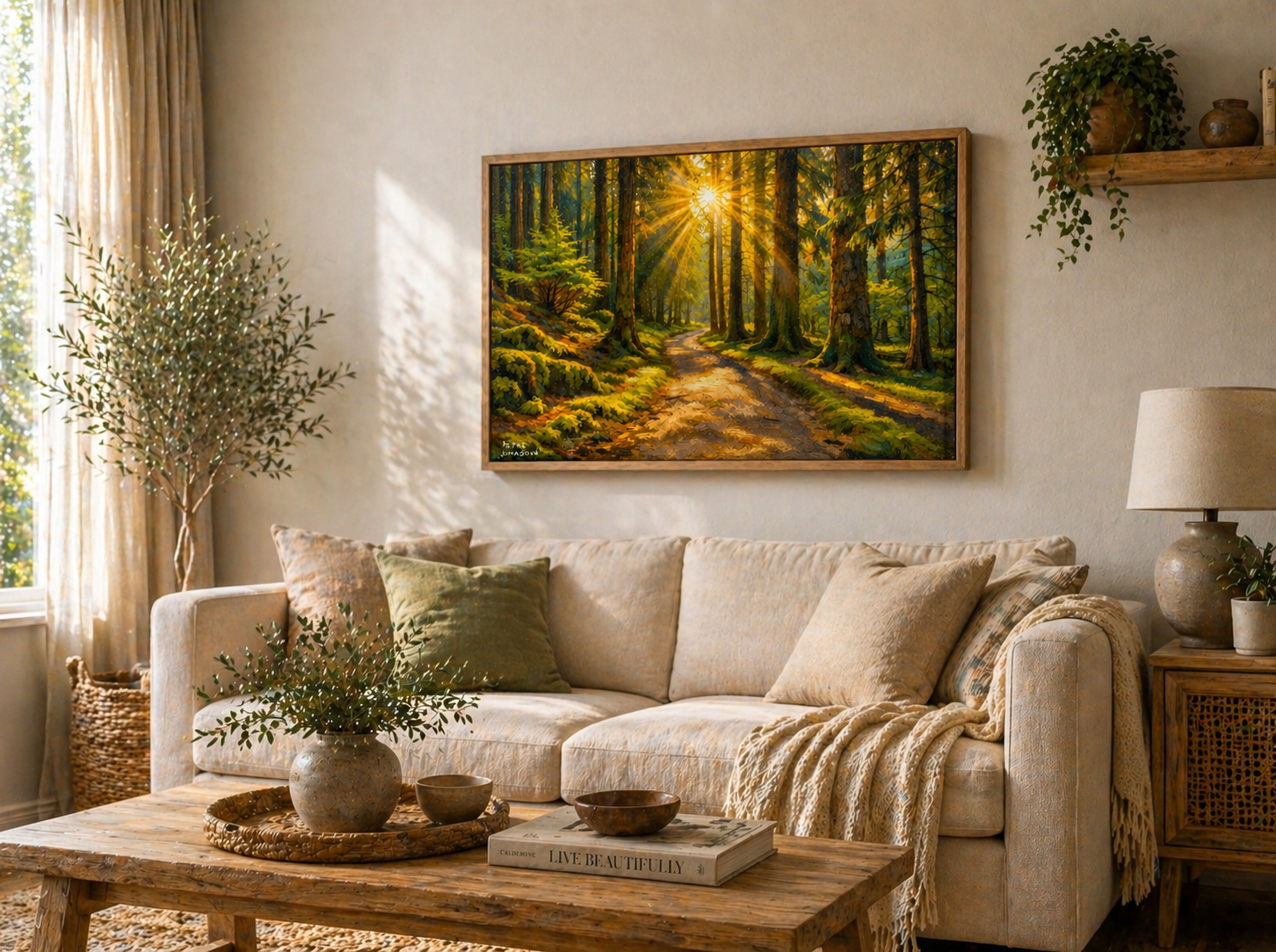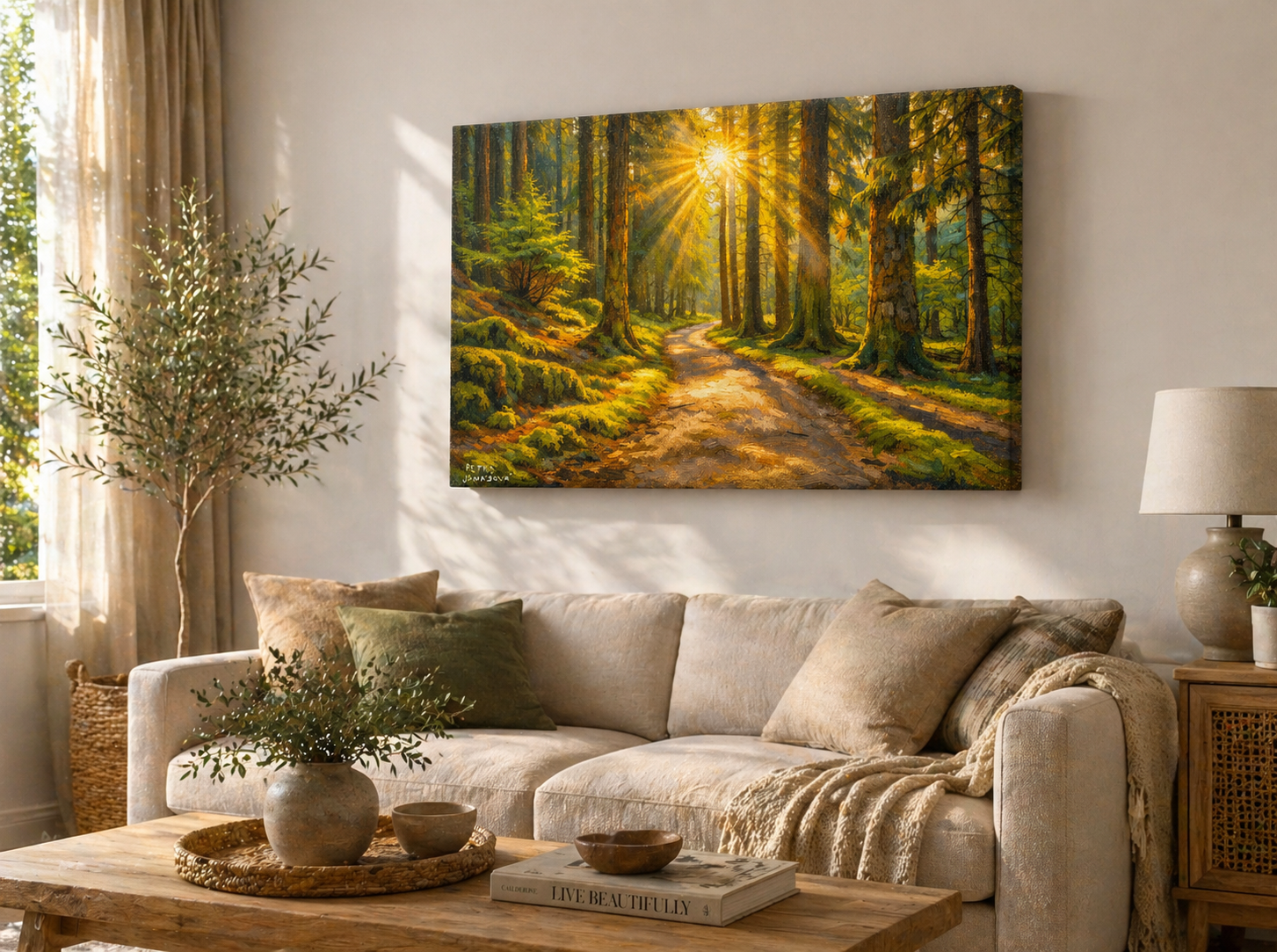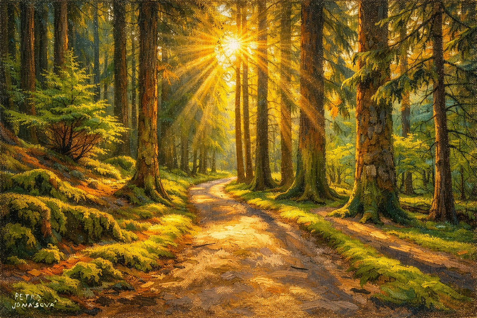 Autorský tisk inspirovaný olejomalbou zachycuje lesní cestu zalitou zlatým světlem, které prostupuje mezi stromy a vytváří hřejivou, téměř magickou atmosféru.