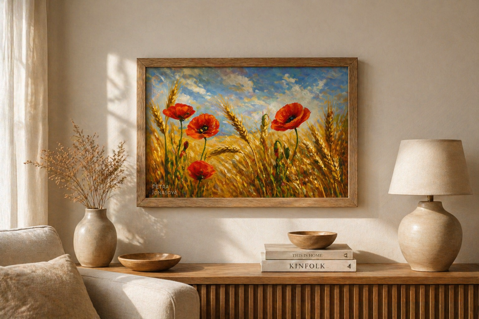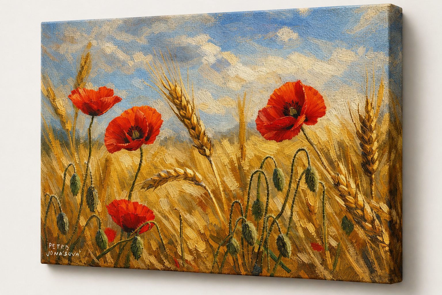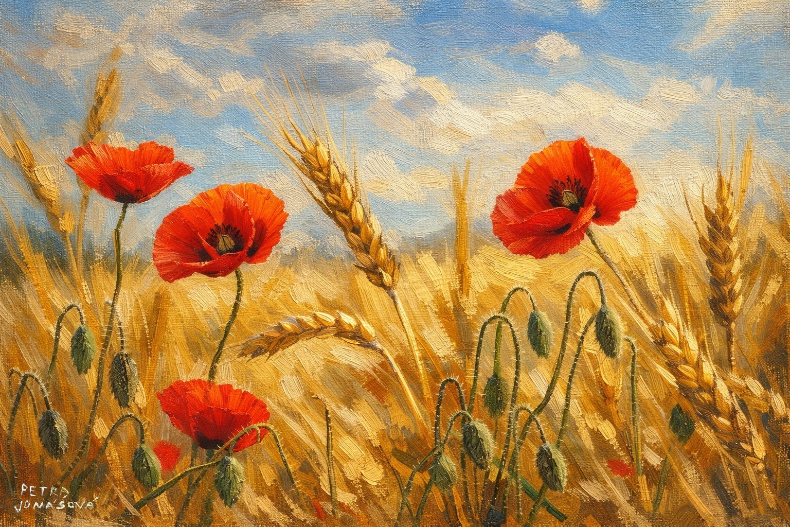 Autorský tisk inspirovaný olejomalbou zachycuje tiché kouzlo letního pole zalitého sluncem. Zlaté klasy se jemně pohupují ve větru a mezi nimi rozkvétají červené máky – symbol lehkosti a života.