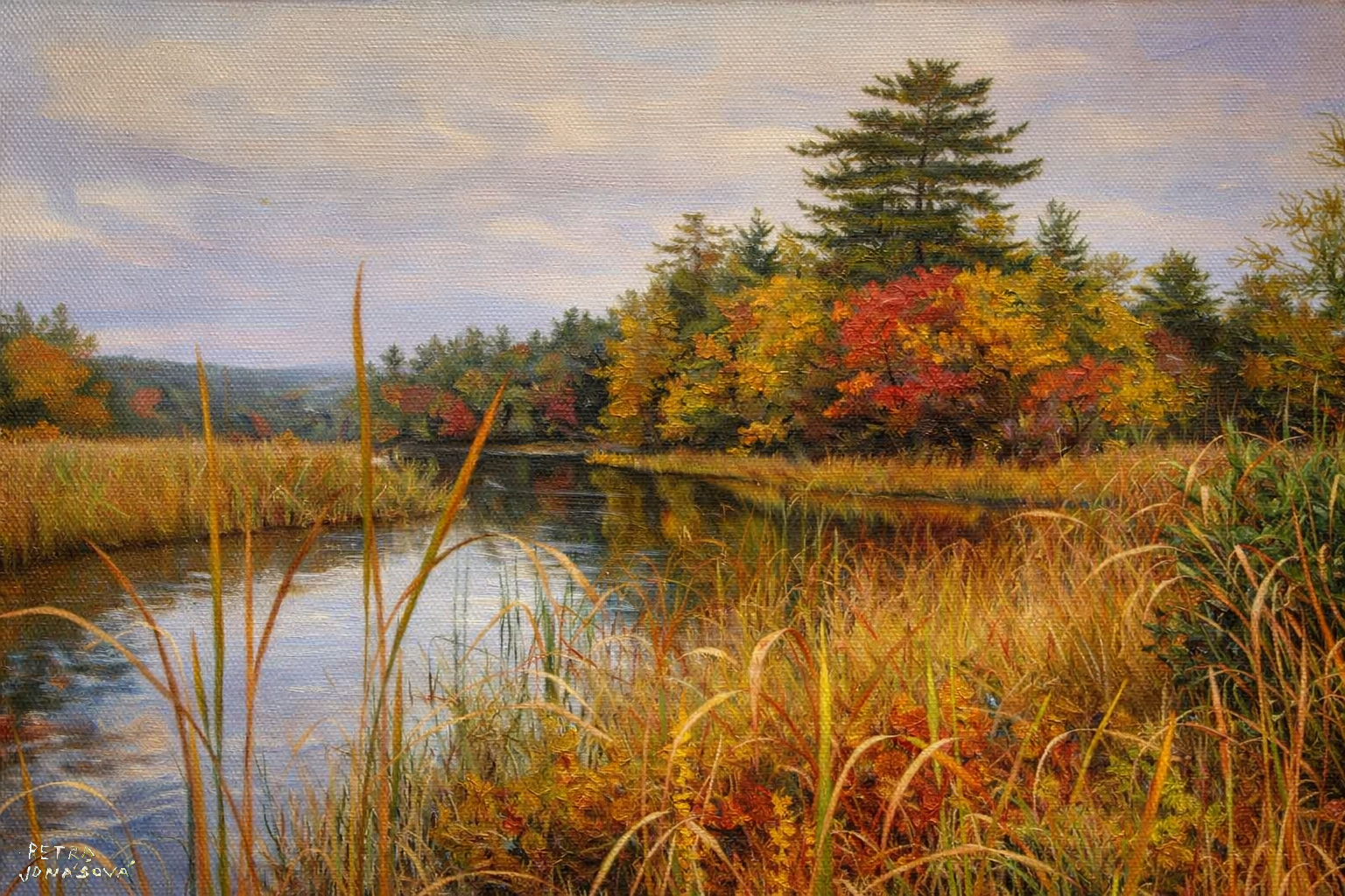Autorský tisk je realizován na kvalitní plátno s vysokou barevnou věrností, aby byla zachována barevná hloubka podzimních tónů i jemné odlesky na hladině vody.