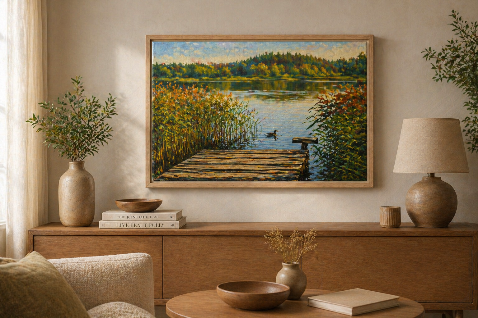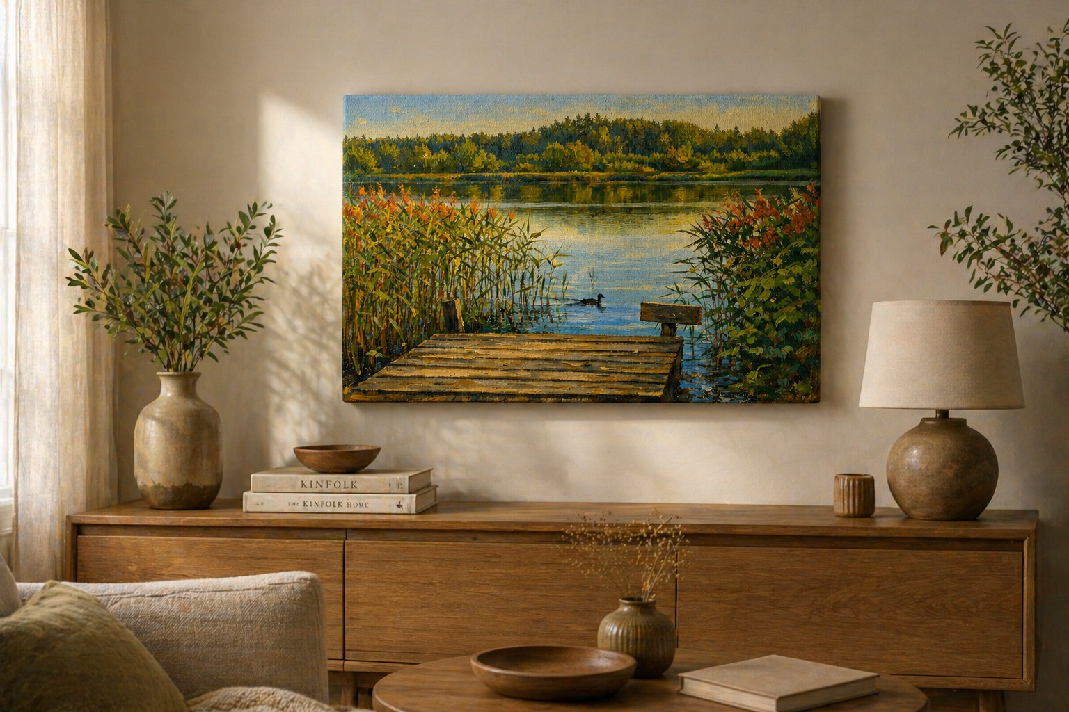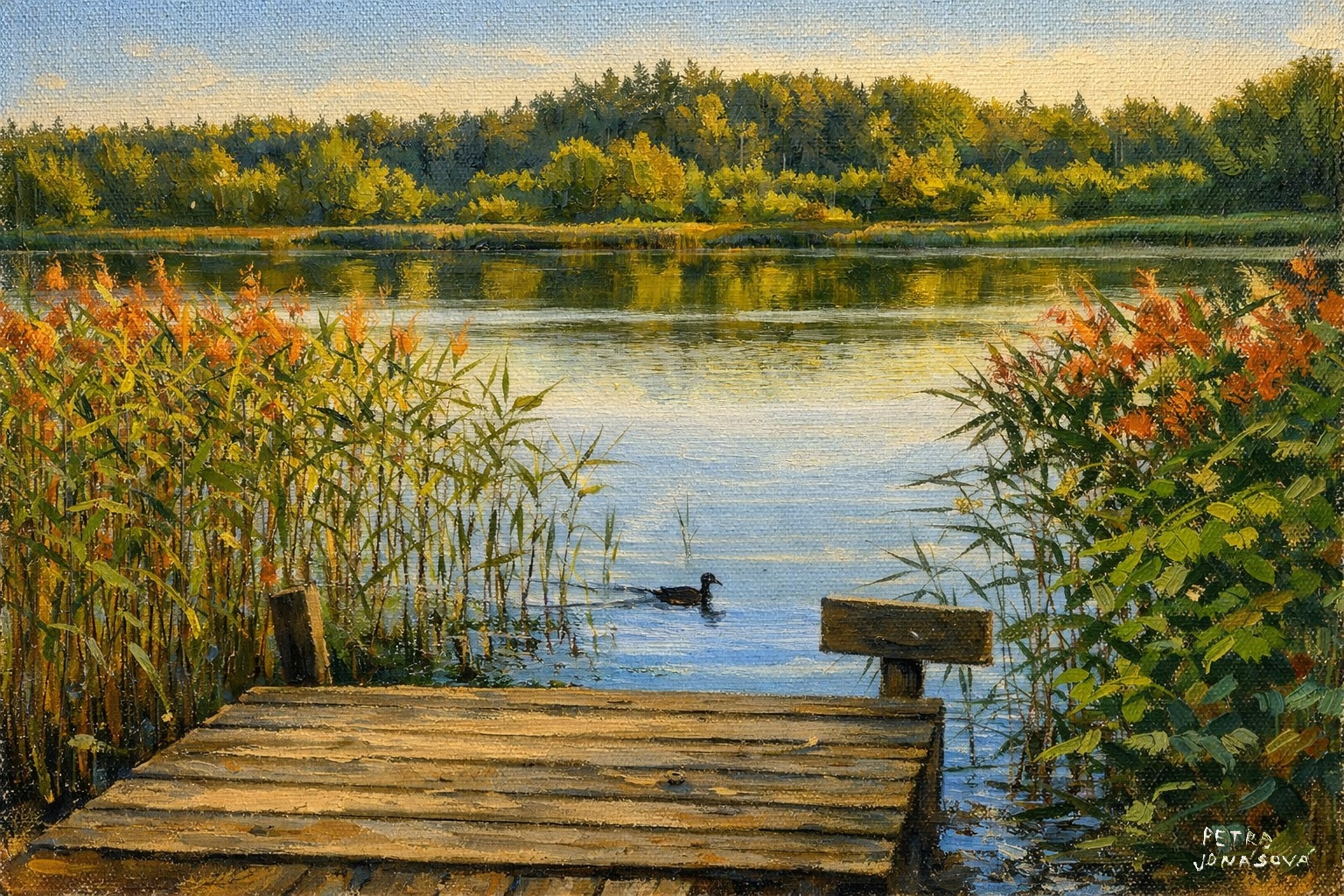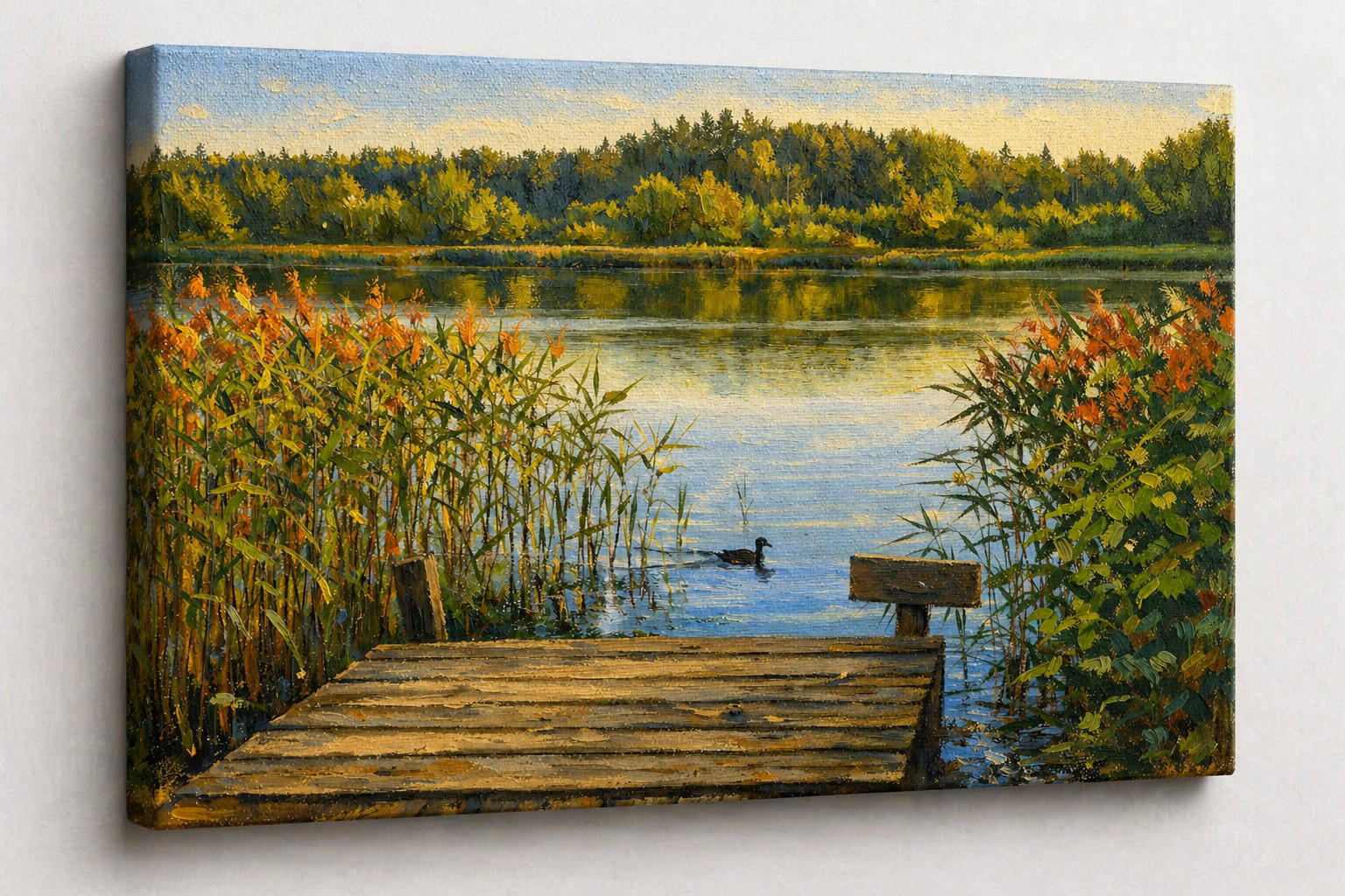 Autorský tisk inspirovaný olejomalbou zachycuje klidnou hladinu rybníka, kde se jemné světlo odráží mezi rákosím a dřevěným molem. Osamělá kachna dotváří atmosféru ticha a přirozené harmonie.